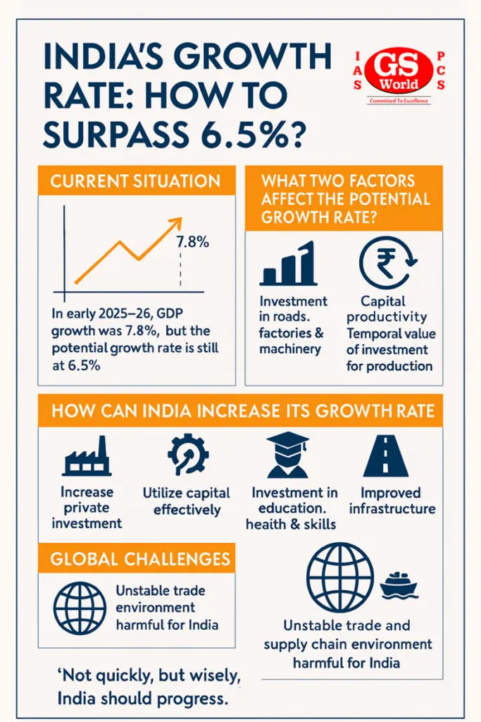 👉 विशेषज्ञों के अनुसार, भारत की असली क्षमता 6.5% की स्थिर विकास दर पर ही बनी हुई है।